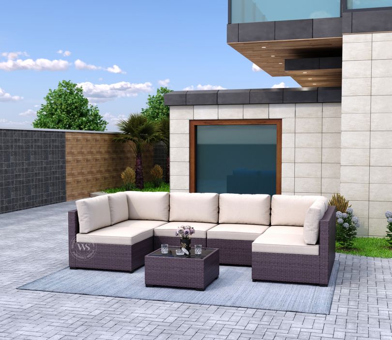 <p><br>A stylish and contemporary <strong>modular outdoor seating set</strong> designed for patios, balconies, or gardens.</p><p>Includes <strong>6-seater arrangement</strong> with a <strong>matching square coffee table</strong>.</p><p>Features a warm, earthy <strong>beige and brown color scheme</strong> for a relaxed, natural look.</p><h3> <strong>Design & Comfort</strong></h3><p><strong>Modular configuration</strong> allows flexible placement to fit different outdoor spaces.</p><p>Equipped with <strong>plush, foam-filled cushions</strong> for superior comfort.</p><p>Removable <strong>beige cushion covers</strong> provide a neutral and elegant contrast to the wicker base.</p><h3> <strong>Material & Durability</strong></h3><p>Made with <strong>all-weather synthetic wicker</strong> for excellent outdoor durability and low maintenance.</p><p>Sturdy internal frame ensures <strong>long-term structural integrity</strong>.</p><p><strong>Tempered glass top</strong> on the coffee table for added safety and easy cleaning.</p><h3> <strong>Functionality & Flexibility</strong></h3><p>Detachable sections allow for <strong>custom arrangements</strong>—L-shape, U-shape, or individual units.</p><p>Ideal for <strong>hosting guests outdoors</strong>, casual lounging, or evening tea time.</p><p>Lightweight yet durable, making it easy to <strong>rearrange or move</strong>.<br> </p>